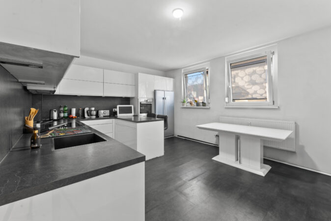 Linker Hand erreichen Sie das ca. 3 m² große Tageslichtbad, ausgestattet mit Dusche, Waschbecken und WC. Das Herzstück der Wohnung ist jedoch die ca. 18 m² große Wohnküche, die 2019 neu eingebaut wurde. Sie verfügt über alle modernen Elektrogeräte, bietet reichlich Platz für eine gemütliche Essecke und wird durch eine praktische Speisekammer mit Waschmaschinenanschluss ergänzt.